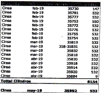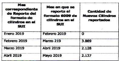 4. CUARTO: Los 8.154 cilindros recibidos entre los meses de febrero, marzo y abril de 2019, se cargaron al sistema único de información bajo la periodicidad mensual de acuerdo a su llegada, la información se reportó bajo el siguiente resumen: