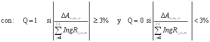 Q: Variable que toma los valores 1 ó 0. Su valor es 1 cuando en el mes m la variable DAn,m,a, en valor absoluto, representa una cantidad igual o superior al 3% respecto de los ingresos reconocidos para los OR en una misma ADD. También tomará el valor de 1 durante los dos meses posteriores al registro de un cambio en la conformación de una ADD.