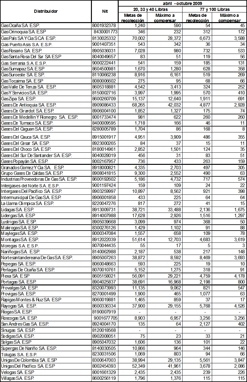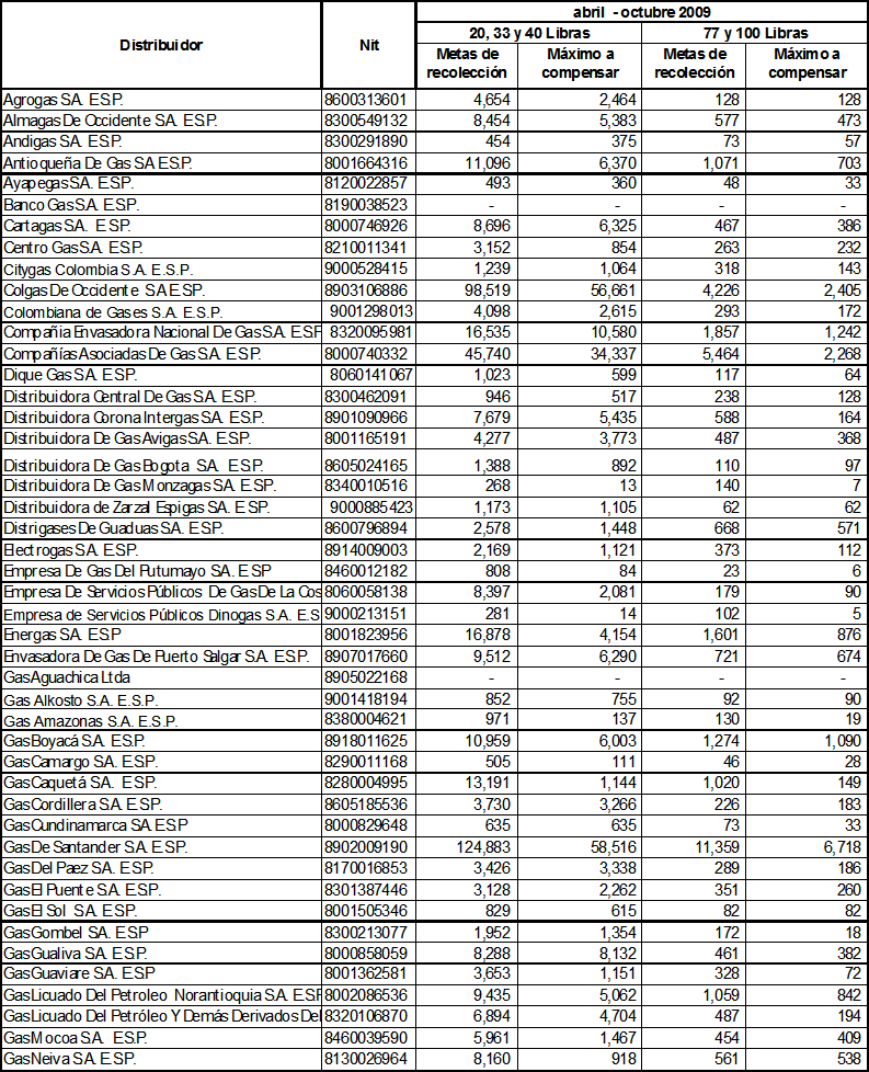 ARTÍCULO 11o. Metas individuales de recolección de cilindros universales a ejecutar durante el período abril a octubre de 2009. Las metas individuales de recolección de cilindros universales utilizados en la prestación del servicio de GLP, que deben cumplir las empresas distribuidoras de GLP durante el período indicado en este Artículo, serán las siguientes:
