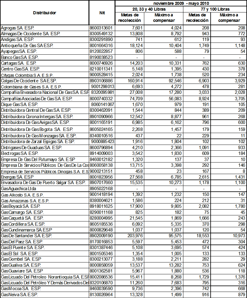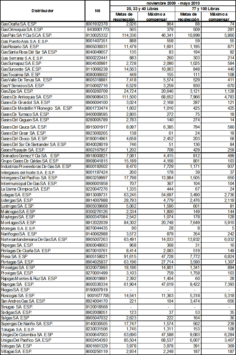 ARTÍCULO 12o. Metas individuales de recolección de cilindros universales a ejecutar durante el período noviembre de 2009 a mayo de 2010. Las metas individuales de recolección de cilindros universales utilizados en la prestación del servicio de GLP, que deben cumplir las empresas distribuidoras de GLP durante el período indicado en este Artículo, serán las siguientes: