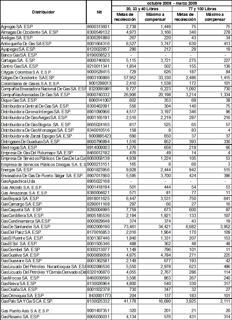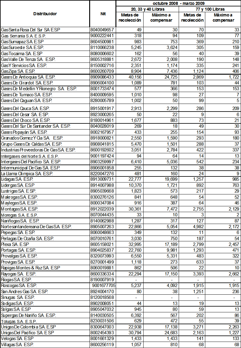 ARTÍCULO 10o. Metas individuales de recolección de cilindros universales a ejecutar durante el período octubre de 2008 a marzo de 2009. Las metas individuales de recolección de cilindros universales utilizados en la prestación del servicio de GLP, que deben cumplir las empresas distribuidoras de GLP durante el período indicado en este Artículo, serán las siguientes: