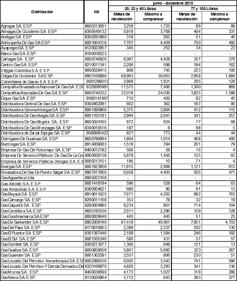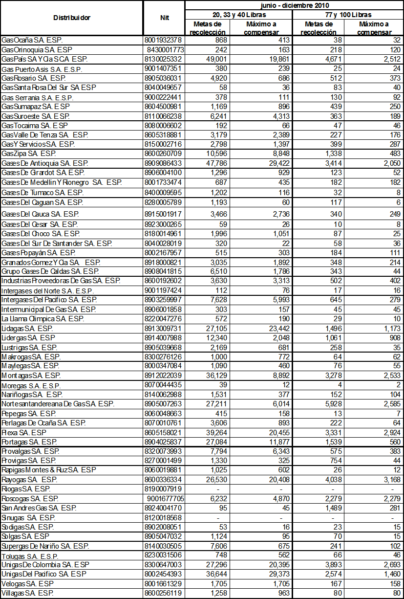 ARTÍCULO 13o. Metas individuales de recolección de cilindros universales a ejecutar durante el período junio a diciembre de 2010. Las metas individuales de recolección de cilindros universales utilizados en la prestación del servicio de GLP, que deben cumplir las empresas distribuidoras de GLP durante el período indicado en este Artículo, serán las siguientes: