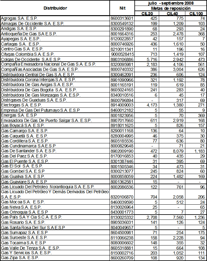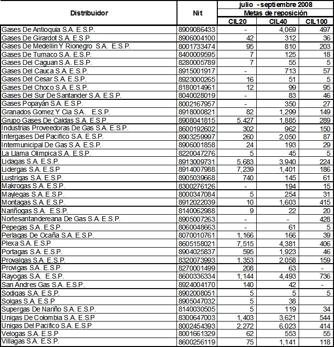 ARTICULO 7o. Metas Individuales de Reposición de Cilindros Universales. Durante el período comprendido entre el 1 de julio y el 30 de septiembre de 2008, los distribuidores podrán continuar reponiendo cilindros universales con cargo a los recursos del margen de seguridad, en una cantidad máxima de cilindros correspondiente a la indicada, de manera individual y por tamaño de cilindro, en el Anexo 1 de esta Resolución