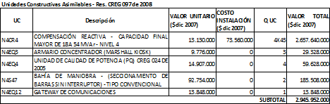 · En segundo lugar, un caso similar se presenta para el registrador de eventos, UC N4EQ4E, para el cual en el numeral 4.3.d) del Documento 032 se calcula un valor total de la UC por $ 23.064.087 ($dic/07), correspondiente a un valor de instalación de $ 1.774.107 ($dic/07), mientras que en la tabla de cálculo de costos del numeral 5 se incluye un valor de $ 4.141.958 ($dic/07).