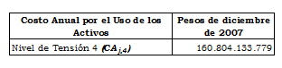 “Artículo 1. Costo Anual por el uso de los activos del Nivel de Tensión 4. El Costo Anual por el Uso de los Activos del Nivel de Tensión 4 operados por CODENSA S.A E.S.P., calculado en la forma establecida en la Resolución CREG-097 de 2008, es el siguiente: