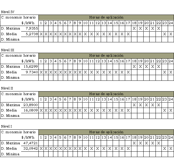 Artículo 1. Cargos monomios horarios Los cargos monomios horarios por uso del Sistema de Transmisión Regional y/o Distribución Local operado por Electrificadora del Cesar S.A., serán los siguientes, a pesos de diciembre de 1996: