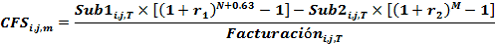 Donde la variable CFSi,j,m corresponderá a la remuneración por el costo financiero asociado al giro de los subsidios al comercializador deficitario i, en el mercado de comercialización j, en el mes m. Esta variable será estimada mensualmente por el comercializador de conformidad con la siguiente fórmula: