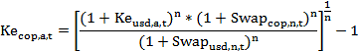 Parágrafo 2. El costo del capital propio en pesos, equivalente al costo del capital propio en dólares, para la actividad , en el momento está dado por la siguiente expresión:Donde,