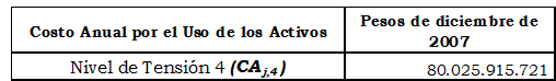 “Artículo 1. Costo Anual por el uso de los activos del Nivel de Tensión 4. El Costo Anual por el Uso de los Activos del Nivel de Tensión 4 operados por la Empresa de Energía del Pacífico S.A. E.S.P., calculado en la forma establecida en la Resolución CREG 097 de 2008, es el siguiente: