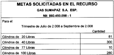 5. El Representante Legal de la empresa Gas Sumapaz manifiesta que no se encuentra de acuerdo con lo establecido en los artículos 10, 11, 12 y 13 de la Resolución CREG 067. Así mismo solicita se revise, analice y evalúe la información reportada al SUI respecto de las compras y ventas de GLP por parte de la empresa. En el cuadro anexo solicita aumento de las metas de recolección y el máximo a compensar para las diferentes vigencias.
