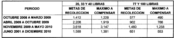 La distribución de estas metas en el tiempo se hizo de tal forma que al inicio del período de transición fueran más flexibles y se fueran concentrando hacia el intermedio del período. Así las metas se distribuyeron para ser ejecutadas en cuatro vigencias con la siguiente distribución del total estimado para recolectar en cada una de ellas, para la primera vigencia se tuvo en cuenta el 15% del parque total, para la segunda el 26%, para la tercera el 41% y para la cuarta el 18%.