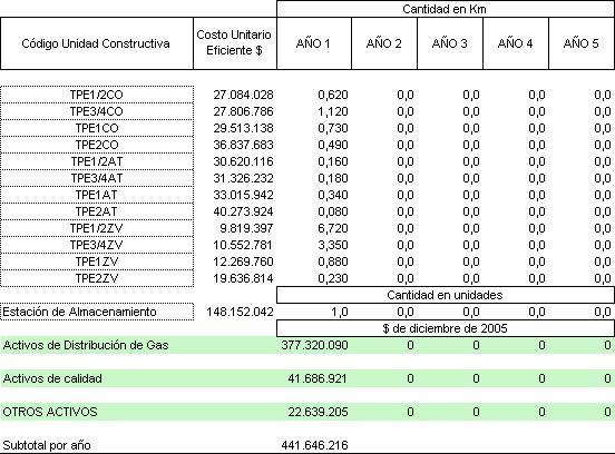 Que la solicitud tarifaria presentada por Surcolombiana de Gas S.A. ESP. incluye las proyecciones de demanda, las proyecciones de gastos de AOM de distribución y el Programa de Nuevas Inversiones, clasificadas según el listado de unidades constructivas establecido en el Anexo No. 1 de la Resolución CREG 011 de 2003;
