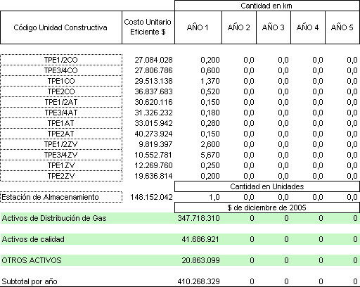 Que la solicitud tarifaria presentada por Surcolombiana de Gas S.A. ESP. incluye las proyecciones de demanda, las proyecciones de gastos de AOM de distribución y el Programa de Nuevas Inversiones, clasificadas según el listado de unidades constructivas establecido en el Anexo No. 1 de la Resolución CREG 011 de 2003;