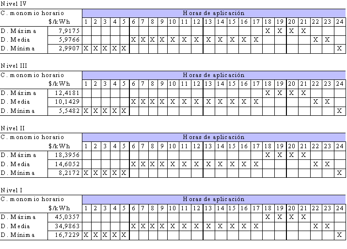 “Cargos monomios horarios. Los cargos monomios horarios por uso del Sistema de Transmisión Regional y/o Distribución Local operado por la Empresa de Energía de Pereira S.A.-E.S.P., serán los siguientes, a pesos de diciembre de 1996: