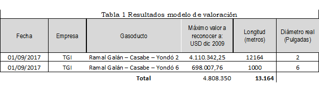 Se procedió a aplicar lo estipulado en la metodología y su Anexo 1 de la Resolución CREG 126 de 2010. Los resultados de la valoración se presentan a continuación: