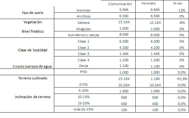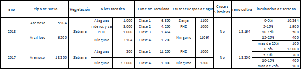 Considerando las diferencias incluidas en la Tabla 1, donde por ejemplo las sumas de los tipos de suelo no corresponden al total en el documento en PDF, se entiende que hubo un error de transcripción en el documento y se utilizará para el presente análisis la información consignada en el archivo Excel entregado en el radicado E-2018-002884.