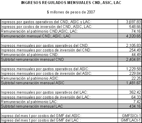 ARTICULO 1o. Ingresos Regulados. A partir del 1º de enero de 2007 y para el año 2007, se establecen los siguientes Ingresos Regulados mensuales por concepto de los servicios prestados por el CND, el ASIC y el LAC en millones de pesos de 2007: