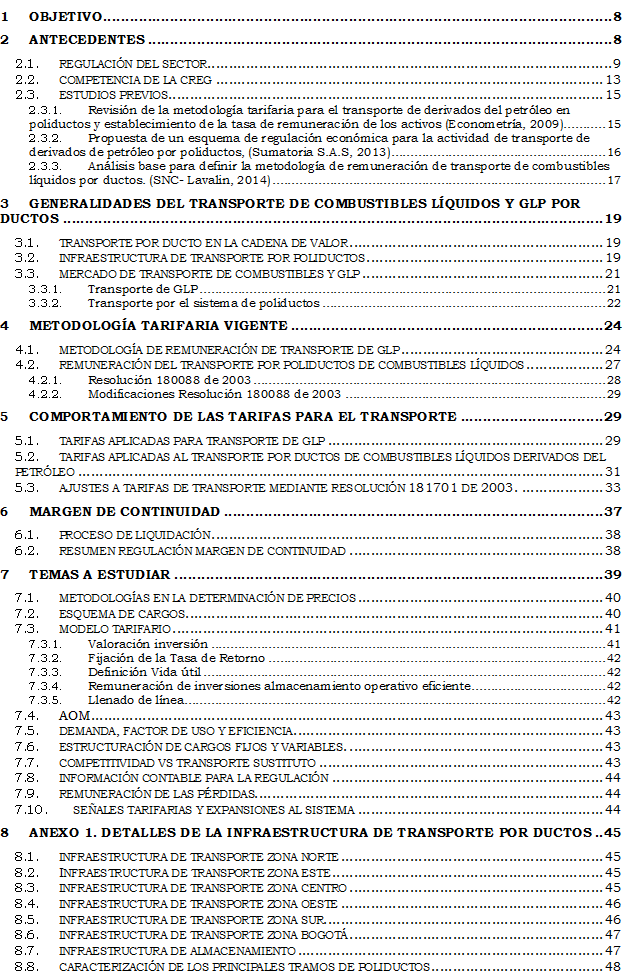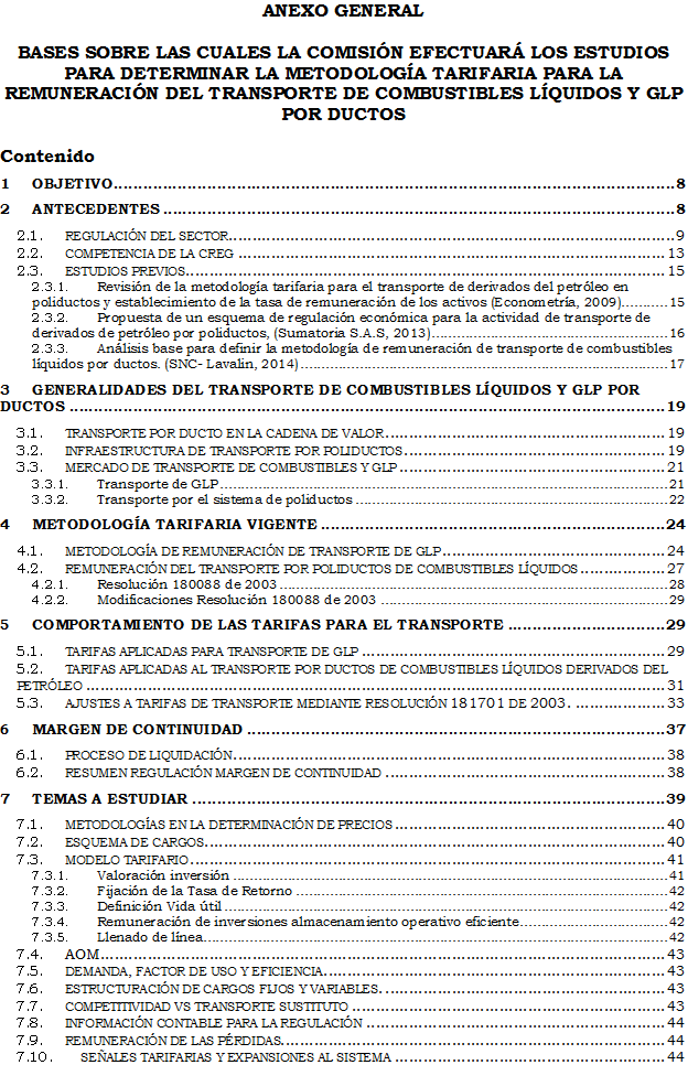 En tal contexto, la Comisión de Regulación de Energía y Gas ha desarrollado las presentes bases para poner a consideración de los agentes de la cadena de combustibles líquidos y GLP así como otros interesados, una propuesta de los temas a estudiar con el fin de presentar una metodología tarifaria que defina la remuneración del transporte por ductos para combustibles líquidos y GLP. En el caso del GLP, tiene como elemento destacado y referencia el análisis de la experiencia resultante de la aplicación de la fórmula contenida en la Resolución CREG 122 de 2008.