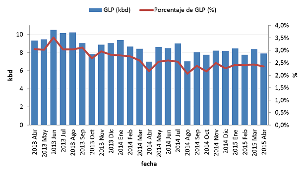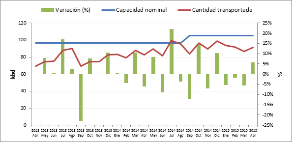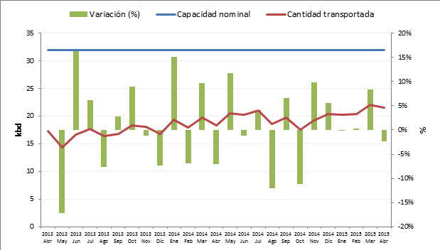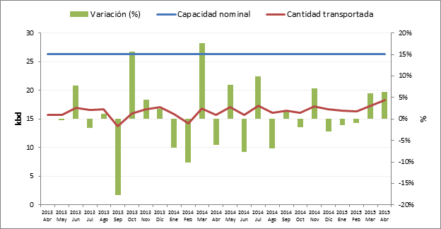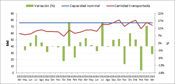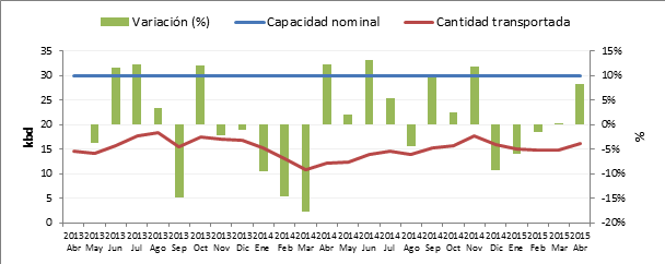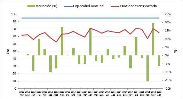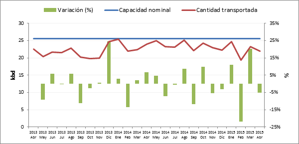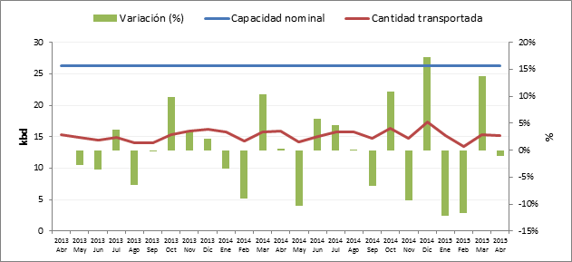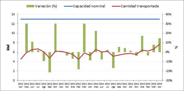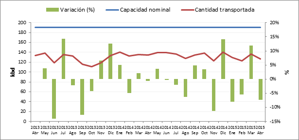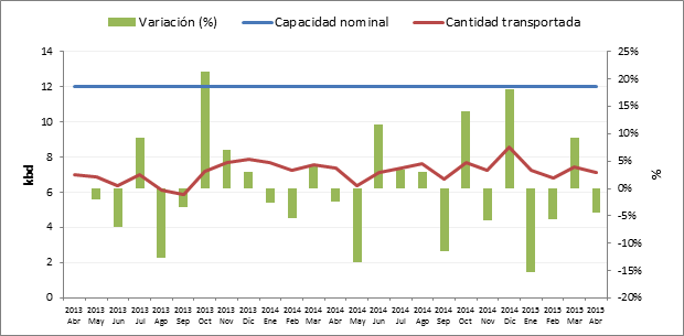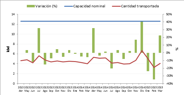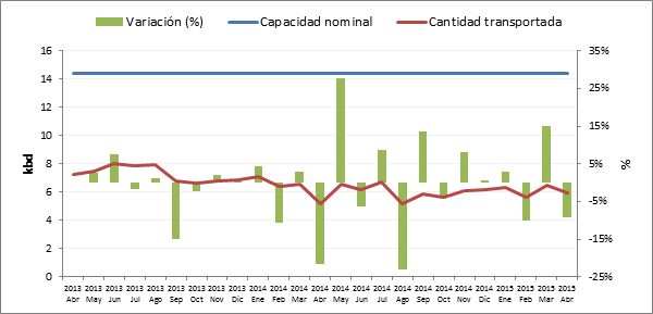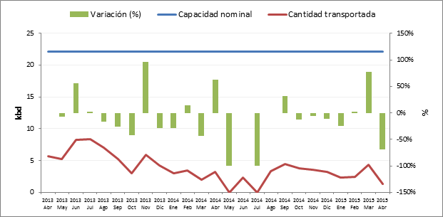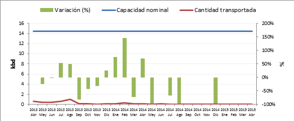 El tramo Puerto Salgar – Mansilla de 8 pulgadas corresponde a un ducto dedicado al transporte de GLP con una capacidad nominal de transporte de 14,4 kbd. En promedio se han transportado 0,2 kbd en el periodo analizado de abril de 2013 a abril de 2015, lo que indica que el porcentaje de utilización promedio de este ducto ha sido de 1,4% con una volatilidad mensual de la cantidad transportada de 28,3%. La gráfica muestra claramente el descenso en la cantidad transportada de GLP, reportando la ocupación más baja de todo el sistema de transporte por ductos.