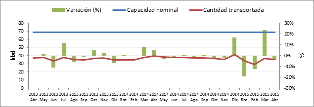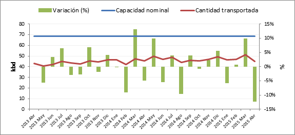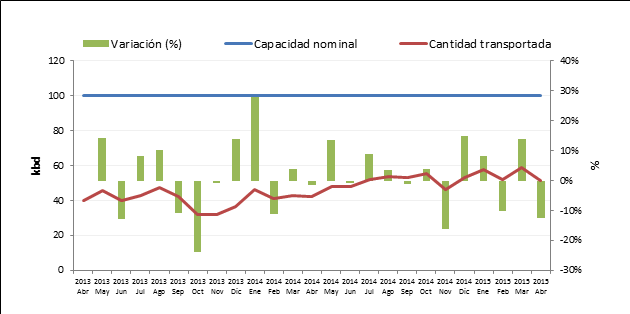 El tramo Sutamarchán – Apiay se utiliza totalmente para el transporte de Nafta que es utilizada para diluir crudos pesados en Apiay. Cuenta con una capacidad nominal de transporte de 100 kbd. Para el periodo que cubre abril de 2013 a abril de 2015, se transportaron en promedio 46,51 kbd, para un porcentaje de utilización promedio de 48,06%. La volatilidad mensual de la cantidad transportada ha sido de 3,1%.