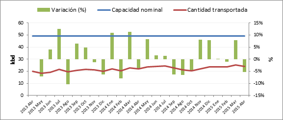 La cantidad transportada través de este tramo presenta una volatilidad mensual de 2%. Los productos que más se transportan por este tramo son: ACEM (43,8%), Nafta importada (47,7%) y Gasolina Motor (8,5%).