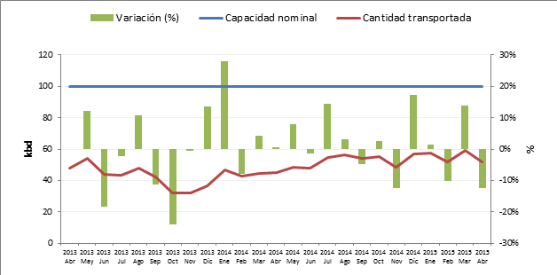 El tramo Sebastopol – Tocancipá cuenta con una capacidad nominal de transporte de 100 kbd. Durante el periodo que cubre abril de 2013 a abril de 2015, se transportaron en promedio 48 kbd, para un porcentaje de utilización promedio de 48,06%. Este tramo ha sido utilizado principalmente para transportar Nafta (98,48%) y la volatilidad mensual de la cantidad transportada ha sido de 3%.