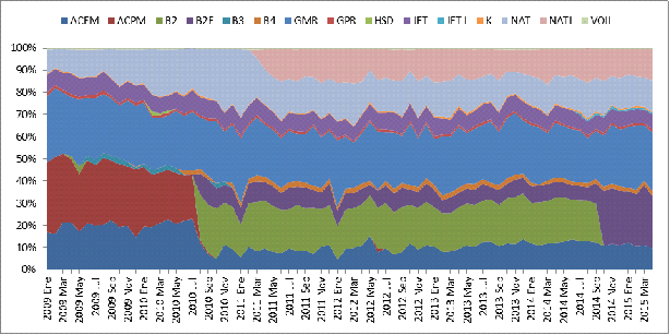 Los productos que más se transportan por este tramo son: Gasolina Motor (48,01%), B2 (36,19%) y B2E (14,34%).
