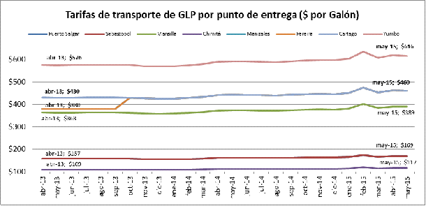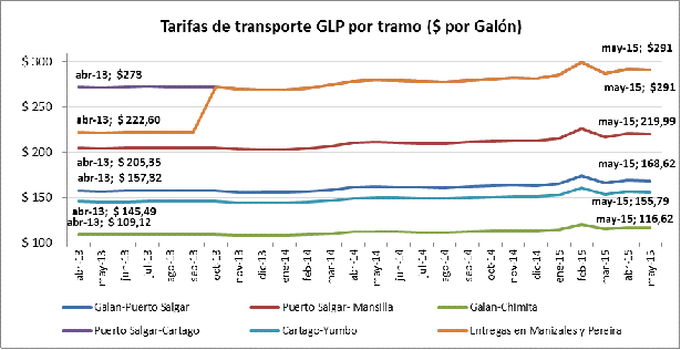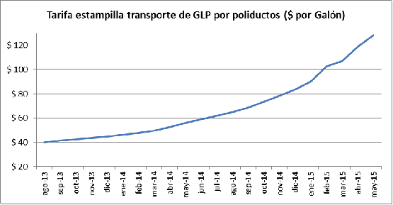 4 La resolución CREG 153 de 2014 que modificó la resolución CREG 092 de 2009 establece que la capacidad de transporte por tramo de ducto corresponde a la capacidad nominal del ducto para el caso de los propanoductos y a la cantidad promedio de GLP transportado durante los últimos cinco años para el caso de los poliductos (en toneladas por día – TOND o miles de barriles día -KBD).