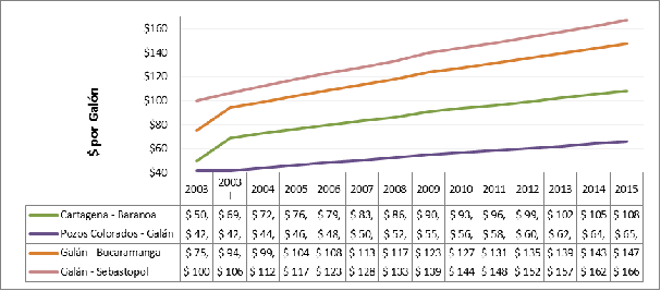 | Resolución 18 0088 de 2003 | Por la cual se reglamentan las tarifas máximas en pesos por kilómetro – galón para el Sistema de Poliductos y se fijan otras disposiciones |
