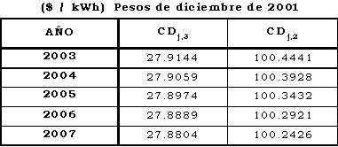 - Cargo de transición para el primer mes de aplicación del Cargo Máximo de Nivel de Tensión 2 aprobado en esta Resolución: 45.7343 $/kWh (pesos de diciembre de 2001).