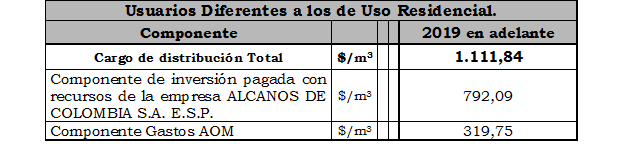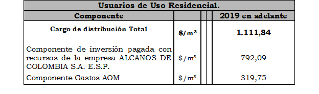 Dado que los sistemas de distribución presentado por las empresas ALCANOS DE COLOMBIA S.A. E.S.P. y C.S.P. Sostenibles S.A. E.S.P. para el mercado relevante solicitado, cuenta con red primaria y secundaria y todos sus usuarios están conectados a la red secundaria, se podrá determinar para este mercado relevante un solo cargo de distribución que será aplicable a los usuarios de uso residencial y usuarios diferentes al uso residencial.