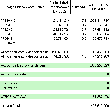 2.1 Inversión Existente: Como inversión existente se reconoce un monto de $1.423.619.099 ($ de dic. 31 de 2002), de conformidad con la desagregación de activos presentada en el Anexo 1A de la presente Resolución.