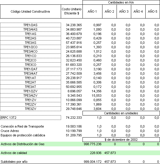 Que Alcanos de Colombia S.A. E.S.P. mediante comunicación con radicado CREG E-2004-003744 del 5 de mayo de 2004, reportó a la CREG las proyecciones de demanda, de gastos de AOM de distribución y el Programa de Nuevas Inversiones, clasificadas según el listado de unidades constructivas establecido en el Anexo No. 1 de la Resolución CREG 011 de 2003;