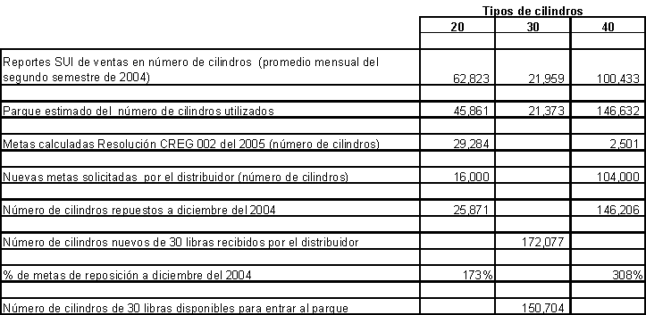 “5ª. En atención al programa de reposición, Colgas de Occidente S.A. ESP, no solamente dio pleno cumplimiento a la meta de 23.590 cilindros fijada en la Resolución anterior, número057/04 de la CREG, sino que de acuerdo con lo expuesto repuso cilindros adicionales como se observa en el siguiente cuadro.