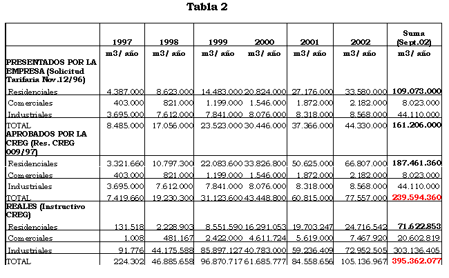 Para el mercado completo, la cifra correspondiente a la proyección de demanda acumulada aprobada por la CREG en la determinación del cargo de distribución fue de 239.59 Mm3. La realidad fue que la empresa facturó a septiembre de 2002 un volumen acumulado de gas de 395.3 Mm3. Es decir, la empresa facturó, a septiembre de 2002, 155.5 Mm3 más que los aprobados como proyección de demanda para el cálculo del cargo de distribución (un 65% de volumen adicional).