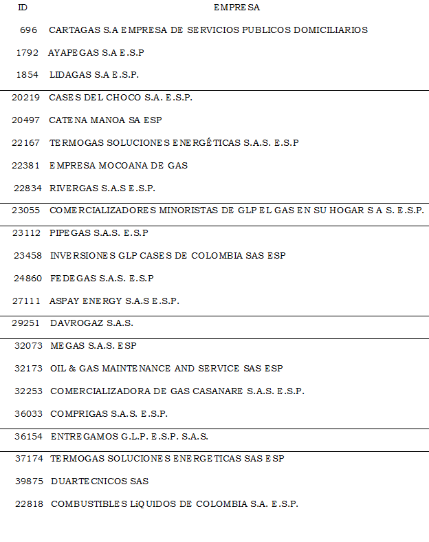 “Artículo 1. Capacidad de Compra. La siguiente corresponde a la Capacidad de Compra en los términos de los artículos 8 y 9 de la Resolución CREG 063 de 2013 para cada uno de los siguientes distribuidores de GLP identificados de acuerdo con el reporte de información en el Sistema único de Información –SUI, así como el Registro Único de Prestadores de Servicios Públicos (RUPS), aplicable para el sexto período de compra: