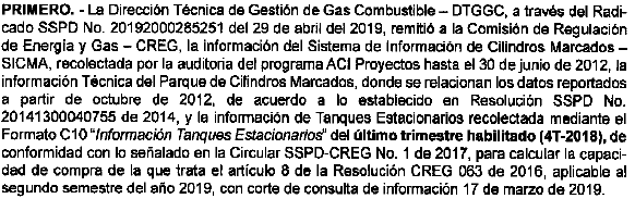 “En atención a su comunicación del radicado del asunto, mediante la cual solicita la información del SICMA, reporte de cilindros al SUI y tanques estacionarios para calcular la capacidad de compra de la que trata el artículo 8 de la Resolución CREG 063 de 2016, modificado por el artículo 1 de la Resolución CREG 180 de 2017, aplicable al segundo semestre de 2019 y considerando lo señalado en el Radicado 201920000284701 de fecha Abril de 2019, mediante el presente escrito estamos enviando la información obtenida de las bases de datos disponibles en el Sistema Único de Información — SUI, en los siguientes términos: