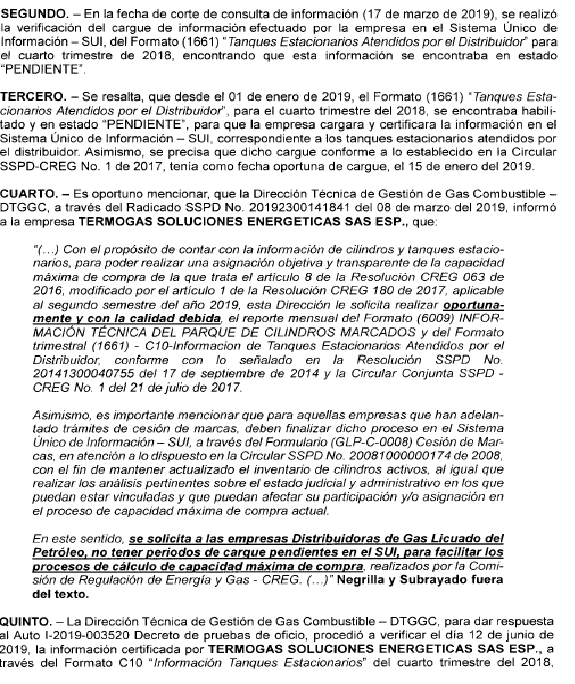 En respuesta al auto de pruebas mediante comunicación 20192300451551 radicado CREG E-2019-006585, la Superintendencia de Servicios Públicos Domiciliarios expuso lo siguiente parta el caso de la empresa Termogas Soluciones Energéticas: