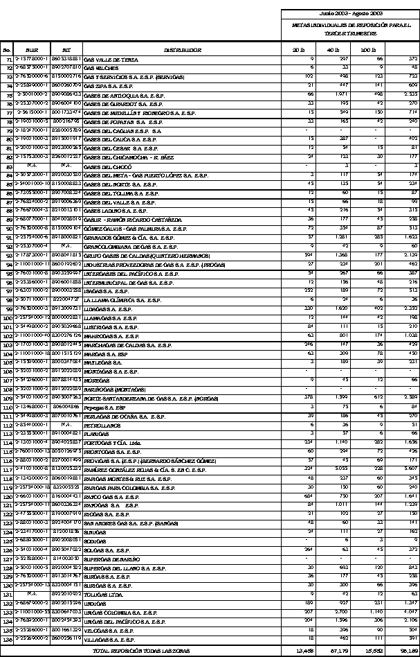 ARTÍCULO 6o. Metas individuales de reposición de cilindros portátiles. Las metas individuales de reposición de cilindros portátiles utilizados en la prestación del servicio de GLP, que deben cumplir las empresas distribuidoras de GLP, están contenidas en el Anexo de esta Resolución.