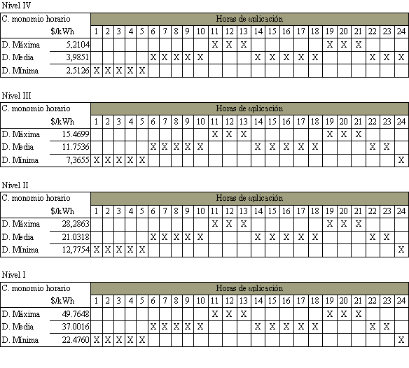 Artículo 2°. Cargos monomios horarios. Los cargos monomios horarios por uso del Sistema de Transmisión Regional y/o Distribución Local operado por la Compañía de Electricidad de Tuluá, serán los siguientes, a pesos de diciembre de 1996: