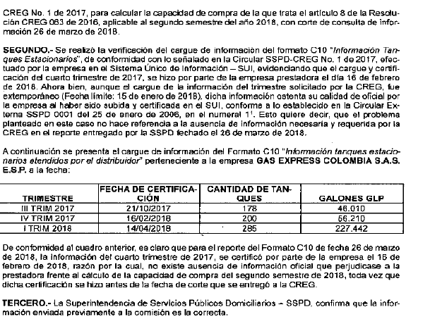 “(…) 1. La Empresa GAS EXPRESS COLOMBIA SAS ESP, como es conocido, ha presentado la información oportunamente ante el SISTEMA UNICO DE INFORMACION SUI de la superintendencia de servicio públicos domiciliarios así: