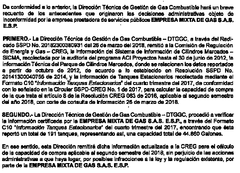 En respuesta al auto de pruebas la Superintendencia de Servicios Públicos Domiciliarios expuso lo siguiente parta el caso de la Empresa Mixta de Gas: