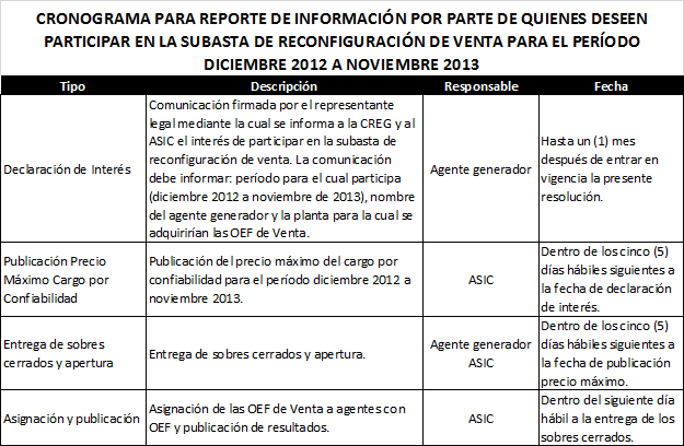 Artículo 4. Cronograma para el reporte de información por quienes deseen participar en la Subasta de Reconfiguración de Venta para el período de vigencia comprendido entre el 1 de diciembre de 2012 y el 30 de noviembre de 2013. Los agentes que deseen participar en la Subasta de Reconfiguración de Venta para el período de vigencia comprendido entre el 1 de diciembre de 2012 y el 30 de noviembre de 2013 deberán remitir la información establecida en el Anexo de esta Resolución en los plazos allí señalados.