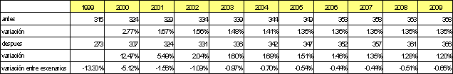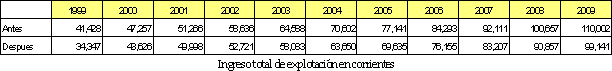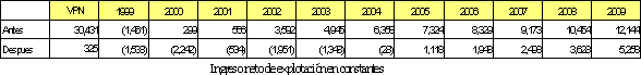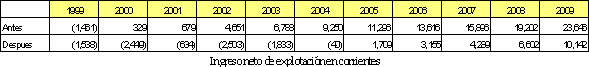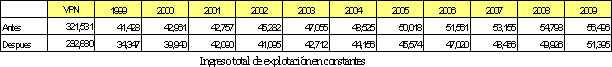 El valor presente neto del flujo de ingresos operacionales 1999-2009, pasa de ser de 321,531 millones de pesos en el escenario antes del terremoto a un valor de 292,680 millones de pesos en el escenario después, significando una caída en los ingresos por valor de 28,851 millones de pesos a valores de 1999 como se aprecia en las tablas siguientes.