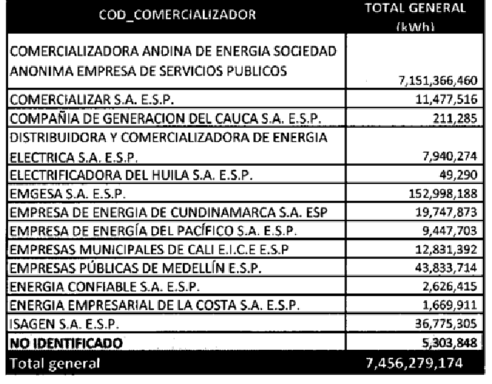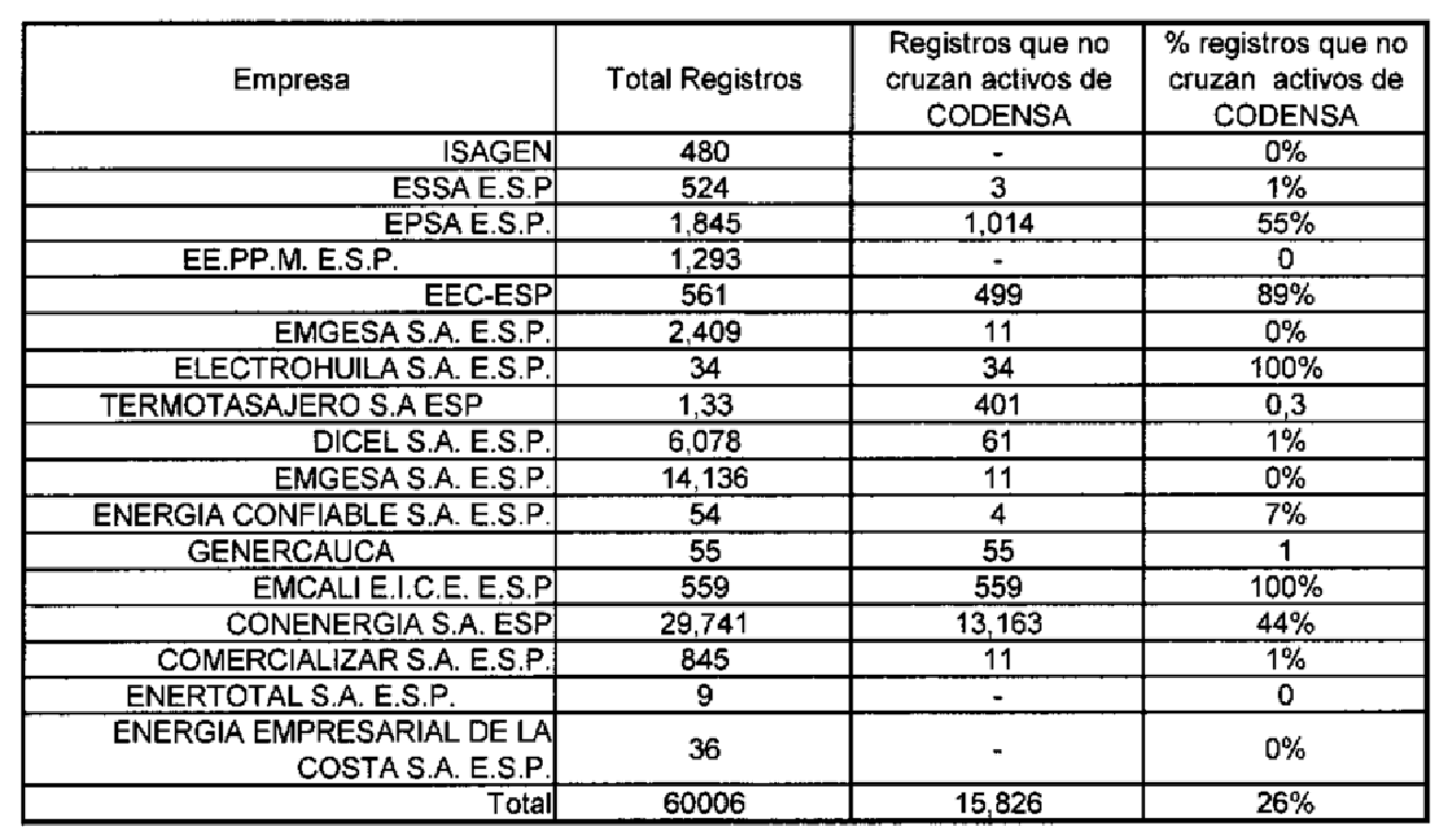Sin embargo, en respuesta a la circular CREG 123 de 2008 la única empresa que respondió sobre este mercado de comercialización fue Codensa S.A. E.S.P. Aunque la respuesta enviada por Codensa S.A. E.S.P. contiene información sobre códigos de conexión utilizados por otros comercializadores de su mercado, sólo el código de conexión 50400, utilizado por EBSA en el mes 12 del año 2006, fue reemplazado por el código equivalente 54591TR1, reportado por Codensa S.A. E.S.P.