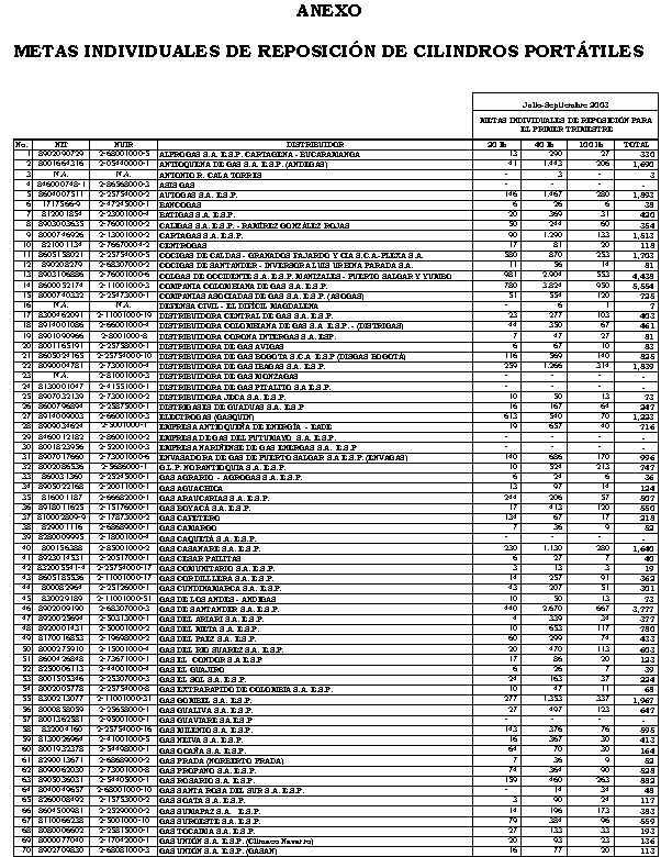 ( 13 MAYO 2003 ) Por la cual se modifica el Anexo de la Resolución CREG 071 de 2002 sobre Metas Individuales de Reposición de cilindros portátiles utilizados en la prestación del servicio de Gas Licuado del Petróleo (GLP), de acuerdo con lo previsto en la Resolución CREG 019 de 2002.