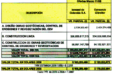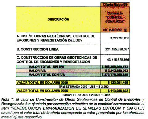 Nota 1: El valor de Construcción de Geotecnia Definitiva fue ajustado por corrección aritmética de la cantidad correspondiente al ítem “REVEGETACION EMPADRIZACION DE SEMILLAS ESTOLON Y CAPOTE”, es así que el valor total de las ofertas corresponde al valor presentado por los oferentes mas el ajuste respectivo.