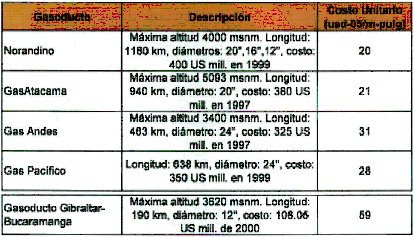 Según lo revela el Documento CREG 035, los valores de los gasoductos andinos fueron los tomados como referencia para la comparación en consideración a que tales gasoductos atraviesan terrenos altamente montañosos y con dificultades geológicas.