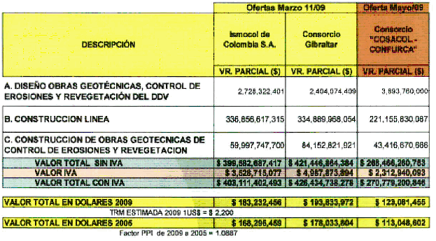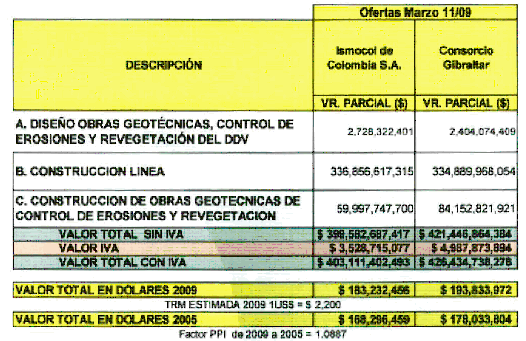 3.17. De acuerdo con el cuadro anterior, las gestiones hechas con los contratistas internacionales, dieron resultado, con una oferta que permitió disminuir en cerca de US$ 60 millones de 2005 la oferta original; es importante anotar que la mayoría de las firmas provenientes de Venezuela, fueron afectadas por las recientes medidas de expropiación del Gobierno Venezolano al sector petrolero, lo cual les impidió presentar una propuesta, en la medida en que no conocían con qué infraestructura contaban.