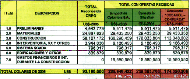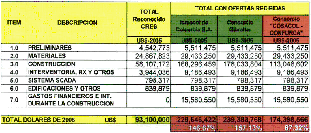 Así, tal y como se puede concluir de los anexos a la presente solicitud, se busca en principio que el regulador involucre los costos derivados de la invitación abierta, o aquellos que la empresa logre conseguir, que sean inferiores a los mismos; en cualquier caso, esos valores son sustancialmente mayores a aquellos aprobados por la Comisión de Regulación de Energía y Gas originalmente.